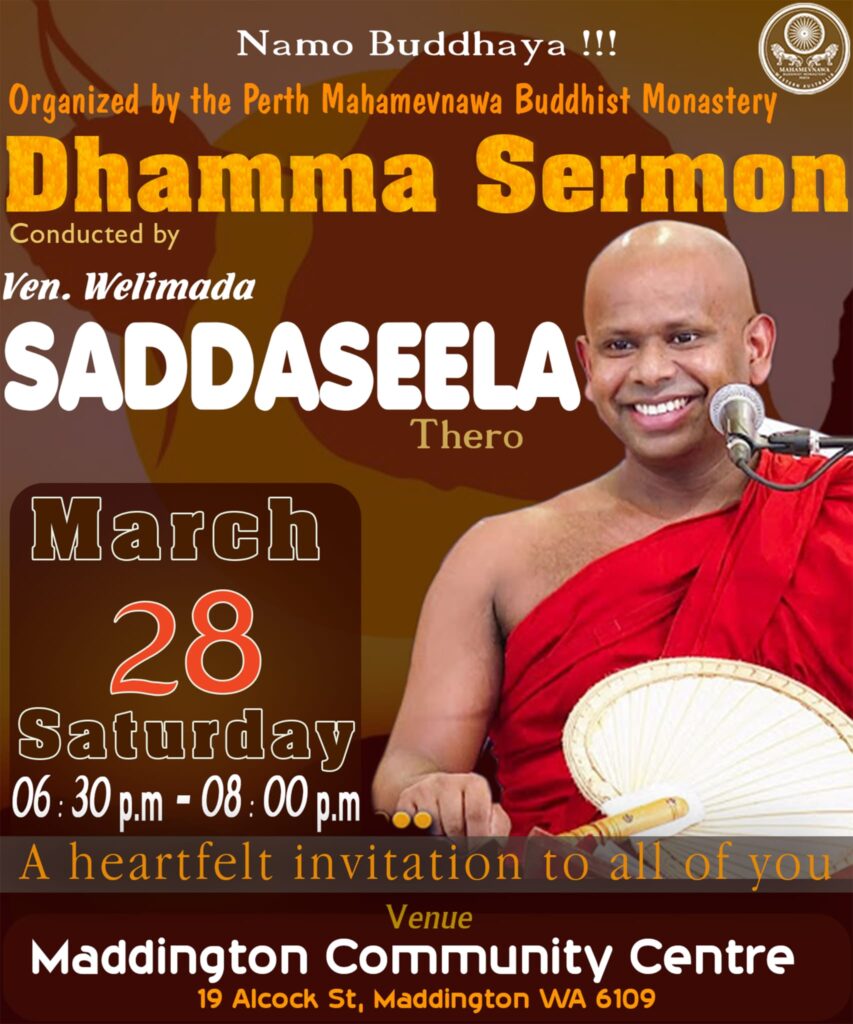 This is a full-day program held on the 1st Saturday of each month from 8.00 am to 4.30 pm at the Maddington Community Centre, 19 Alcock St, Maddington, WA 6109. This program includes the observance of the Eight Precepts, Buddha Puja, Dhamma sermons, Meditation, and Dhamma discussions. ons and various meritorious activities throughout the day.